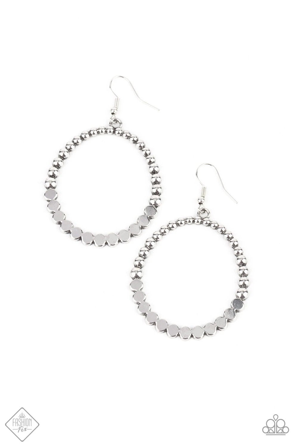 Earring: "Rustic Society" (P5BA-SVXX-114AB)- Antiqued silver studs join with flattened silver discs, creating a rustic front-facing hoop. Earring attaches to a standard fishhook fitting.