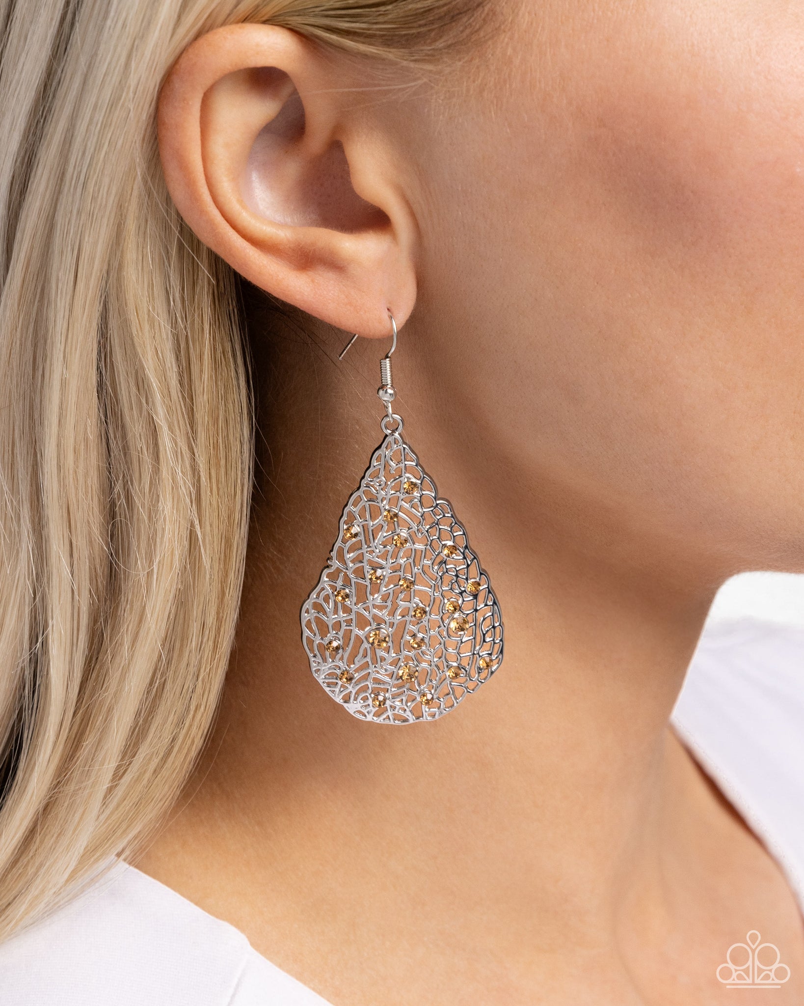 Golden topaz rhinestones are sprinkled across a fractured backdrop of silver, resulting in an abstract twinkle. Earring attaches to a standard fishhook fitting.