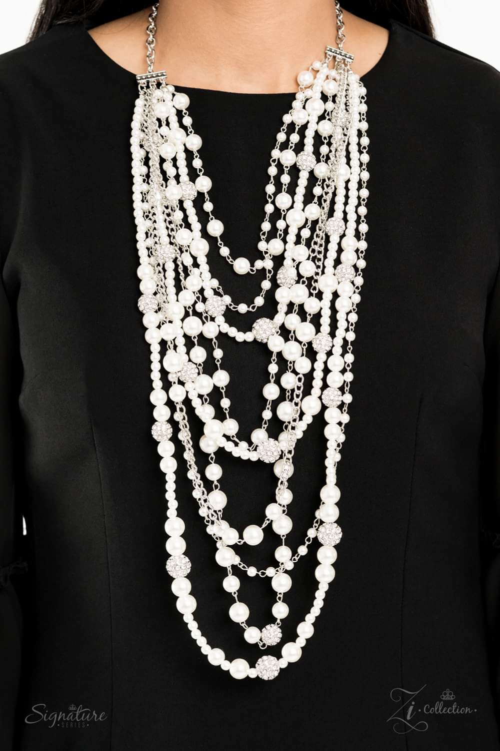 An elegant collection of timeless white pearls, shiny sections of silver chain, and bedazzling white rhinestone encrusted silver beads effortlessly cascade down the chest. The vintage inspired layers drape into breathtaking rows of radiance, resulting in an irresistible collision of romance. Features an adjustable clasp closure.